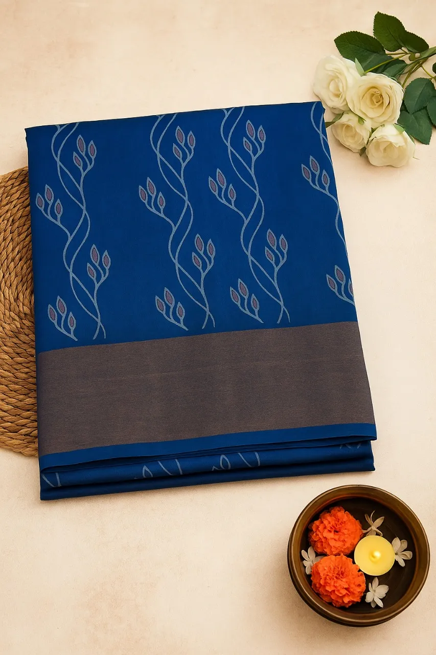 Discover modern elegance with this striking blue saree, featuring unique intertwining vine patterns in a soft grey, complemented by delicate maroon accents and a sophisticated charcoal grey plain border.