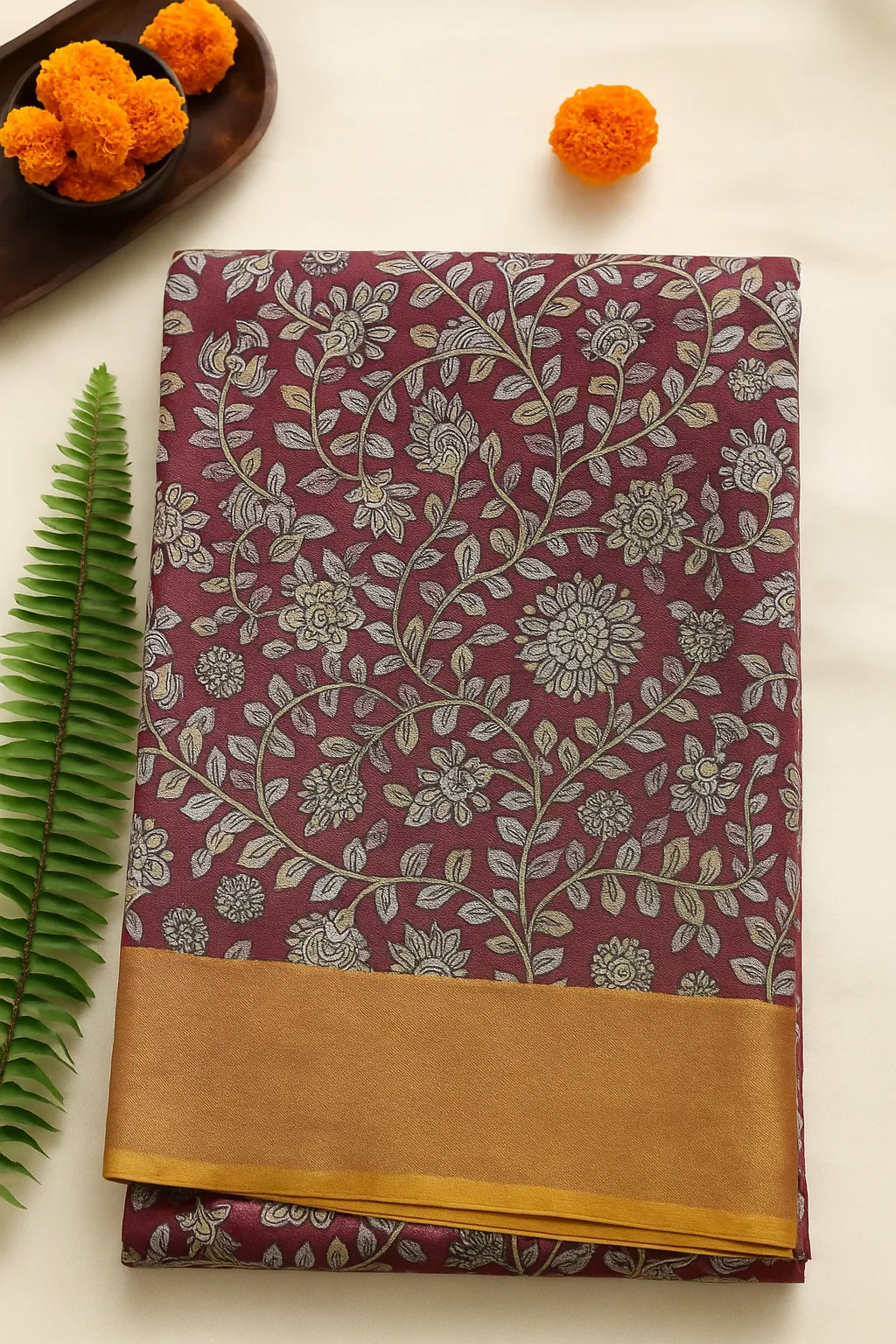 Rich maroon saree adorned with an elaborate pattern of delicate floral vines in muted tones, beautifully complemented by a broad golden border.
