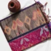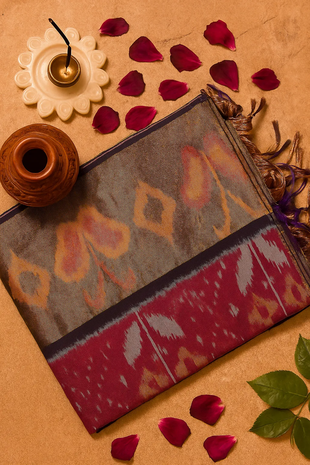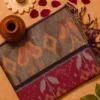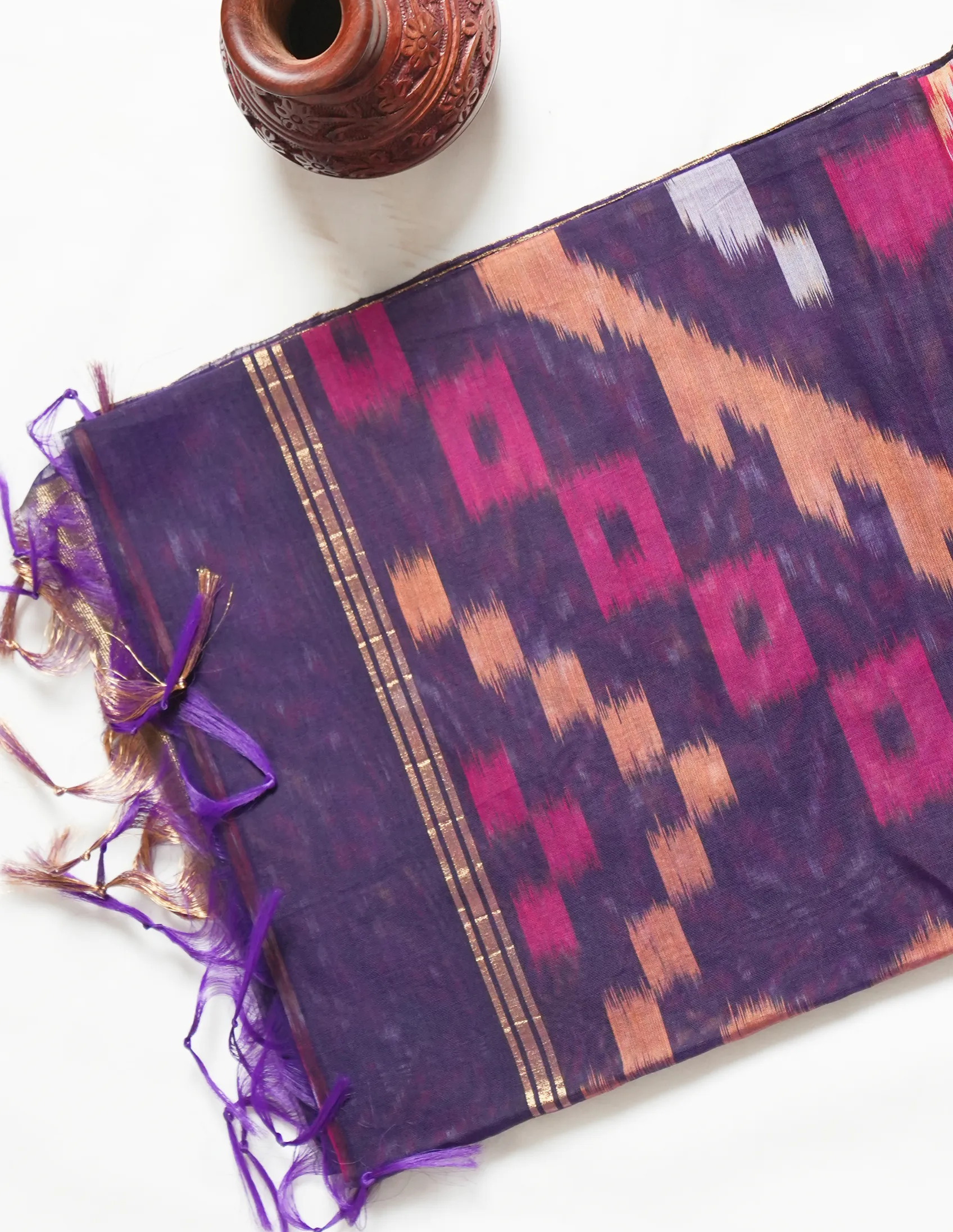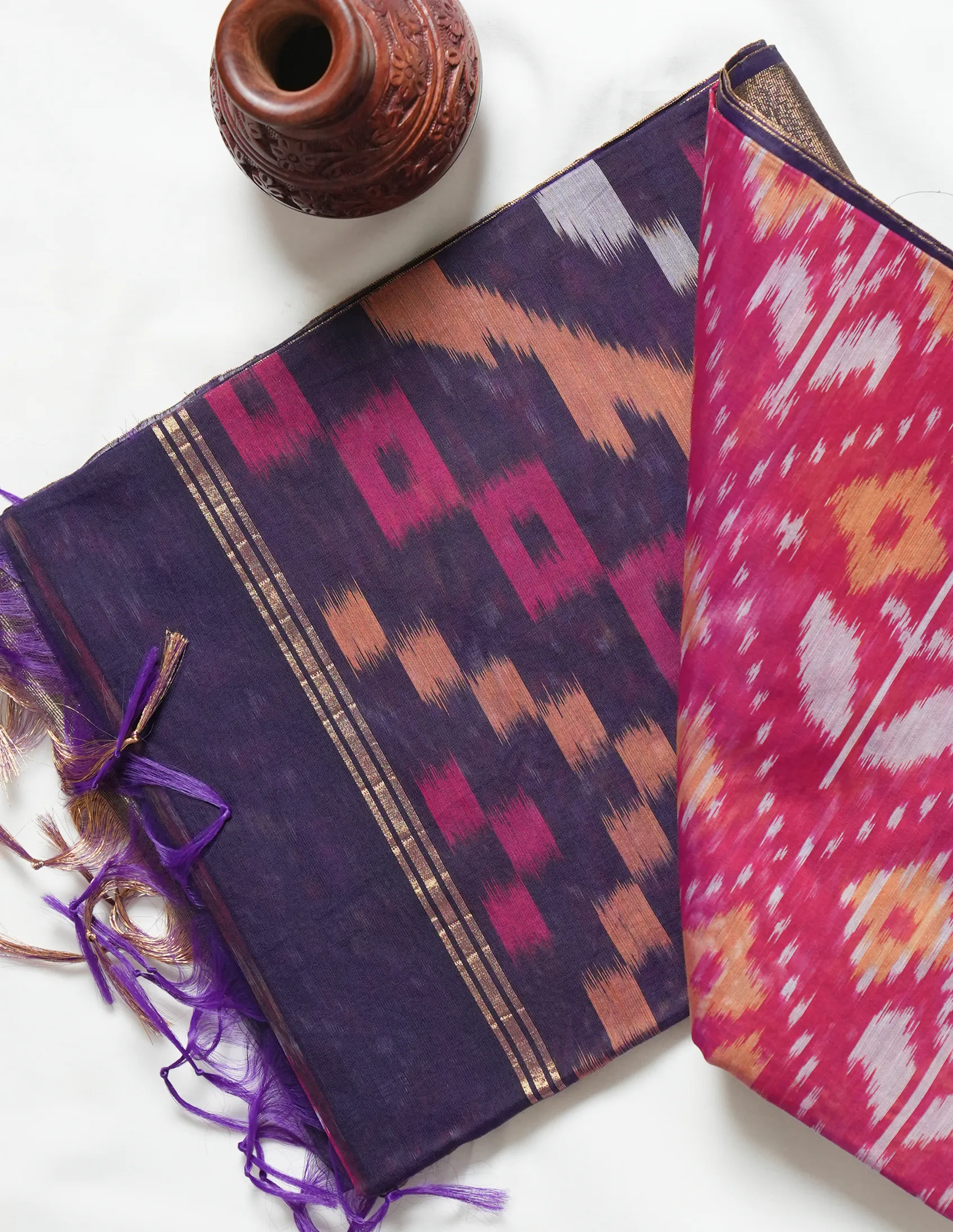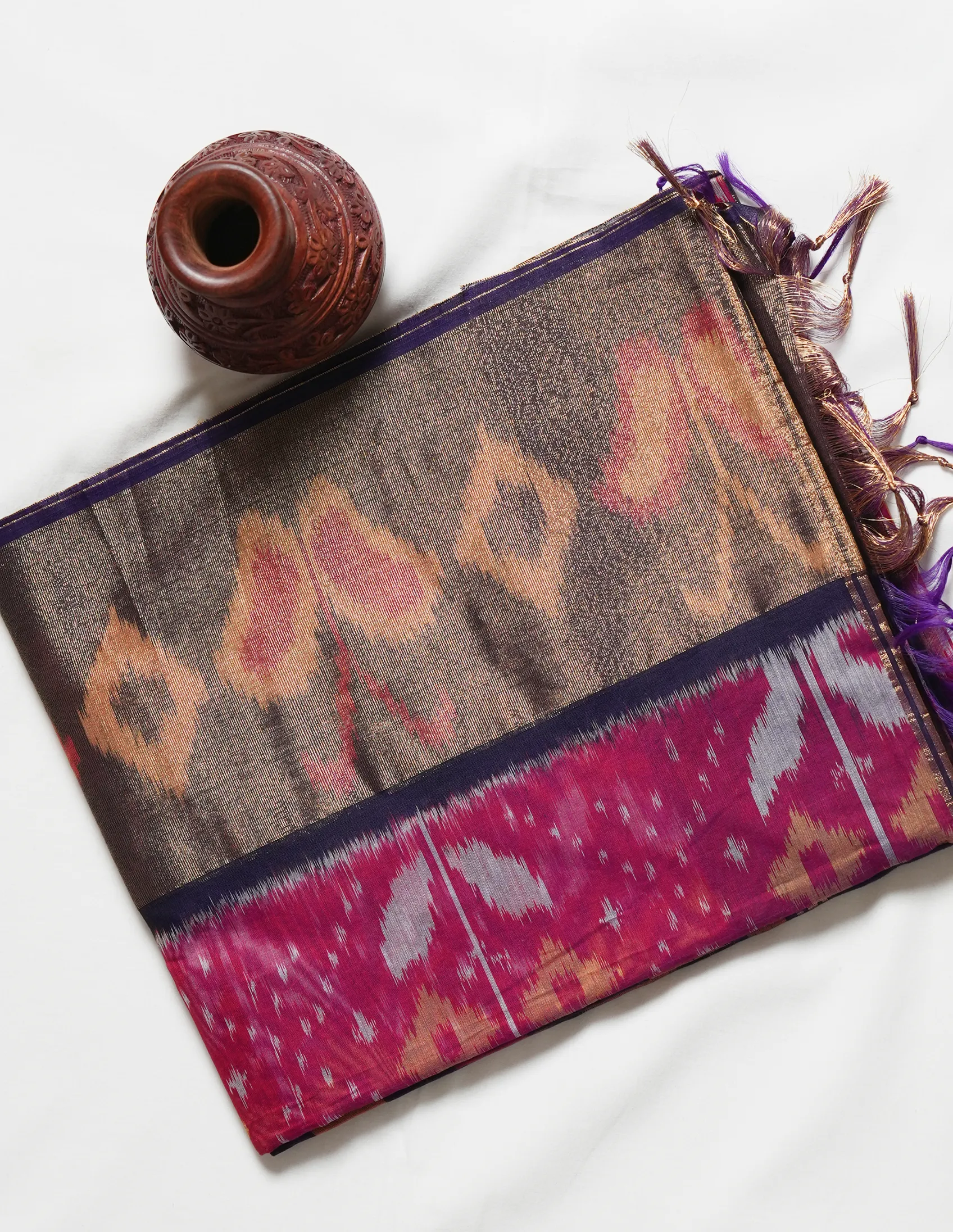 Striking dual-tone ikat saree showcasing bold geometric patterns in deep purple, brown, and a vibrant fuchsia pink. A modern masterpiece of traditional weaving.