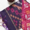 • Distinct Dual-Tone Design: Features a captivating contrast between two sections: one in a deep indigo or purple with geometric block-like ikat patterns in brown and fuchsia, and the other in a vibrant fuchsia or bright pink with more fluid, abstract ikat motifs in orange and white/grey.