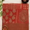 - Solid Border: A wide, solid reddish-brown (or terracotta) border beautifully defines the lower edge of the saree, providing a warm and grounding contrast that complements the vibrant red.